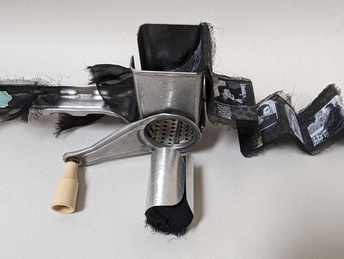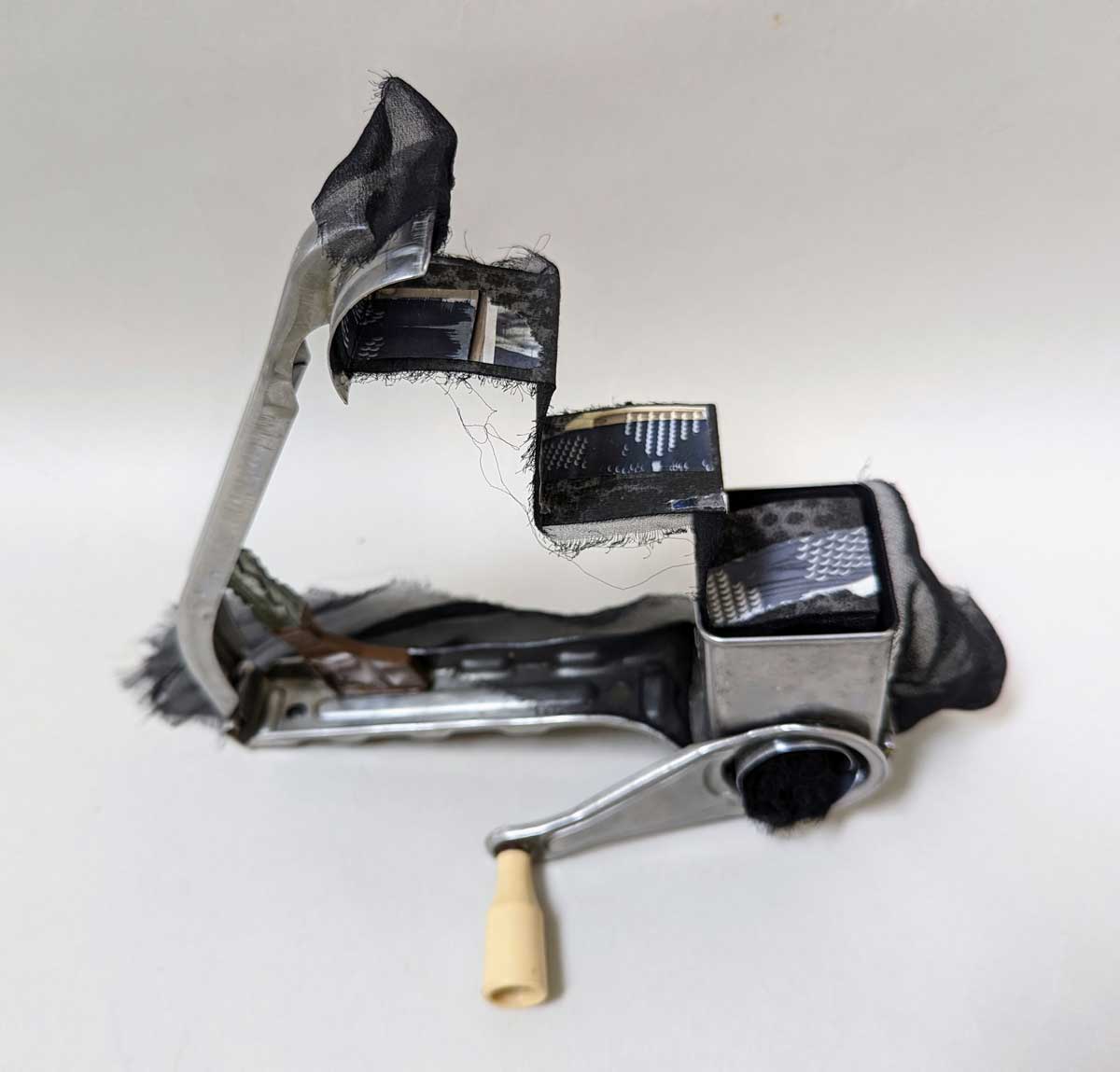 Materials: Rotary cheese grater; black papier d’Arches; photographs; black silk scraps; aluminum; glaze drop