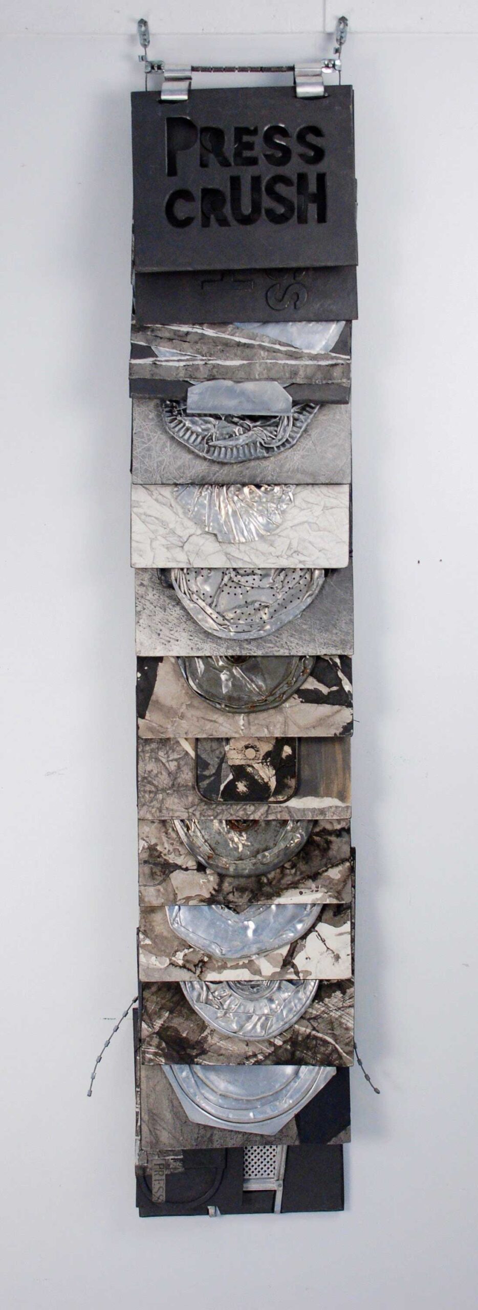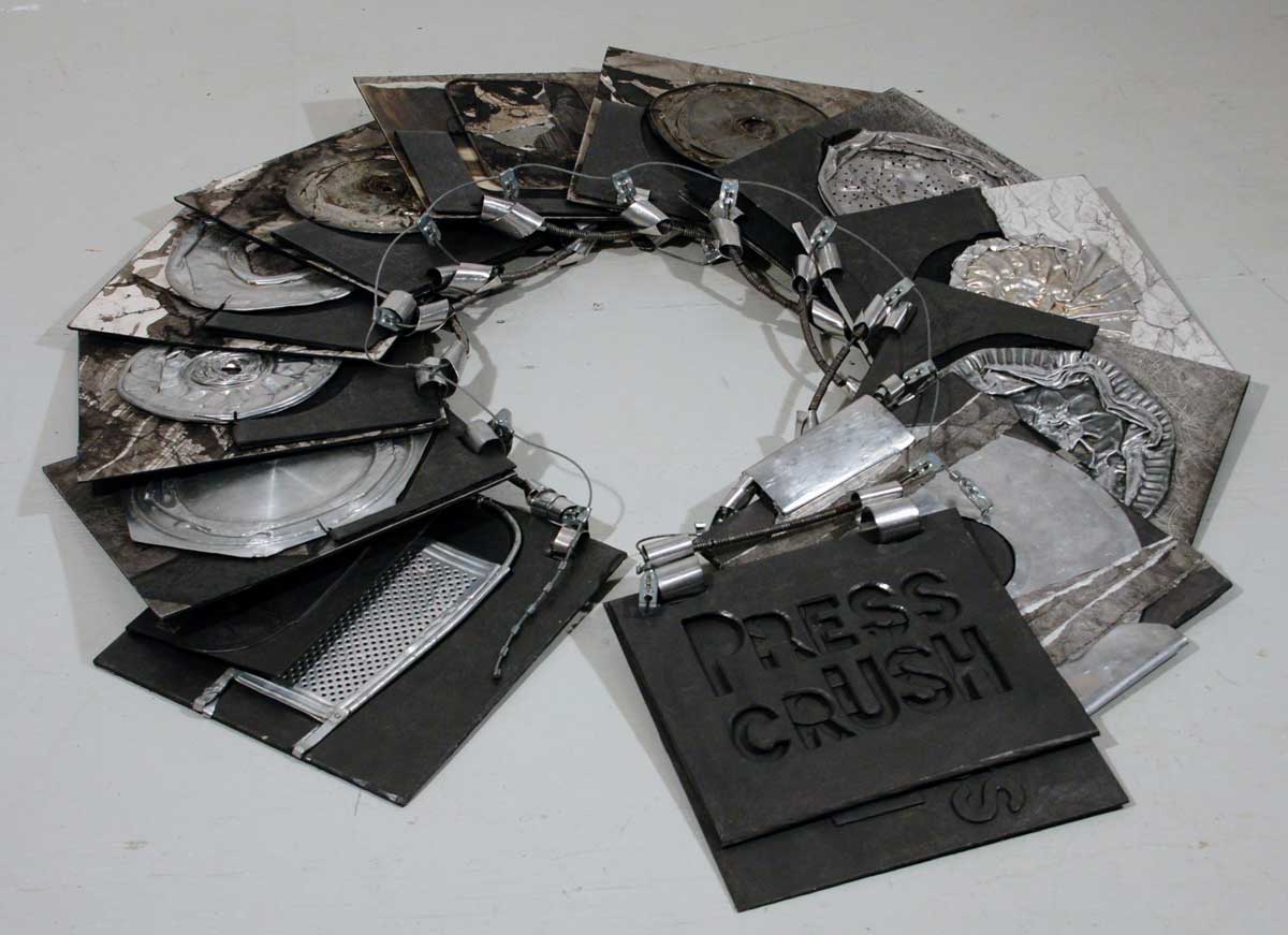 Artist Statement about the work: Press/Crush, a unique sculptural artist book, incorporates aluminum kitchen objects that have been flattened with a steamroller. These objects, combined with drawings, rubbings, prints, and collages, form the pages of this exploration of crushing pressure. The double pages fold open to support the structure; the crushed objects hang suspended within the page spreads. The pages are loosely bound with coiled strips of aluminum that attach to a tire chain from a school bus. The text on the last page riffs on the word “press”, forming a visual poem on woven strips: press press press re/press de/press press op/press com/press de/com/press press ex/press/ion press press im/press/ion im/press/ive press/ure.