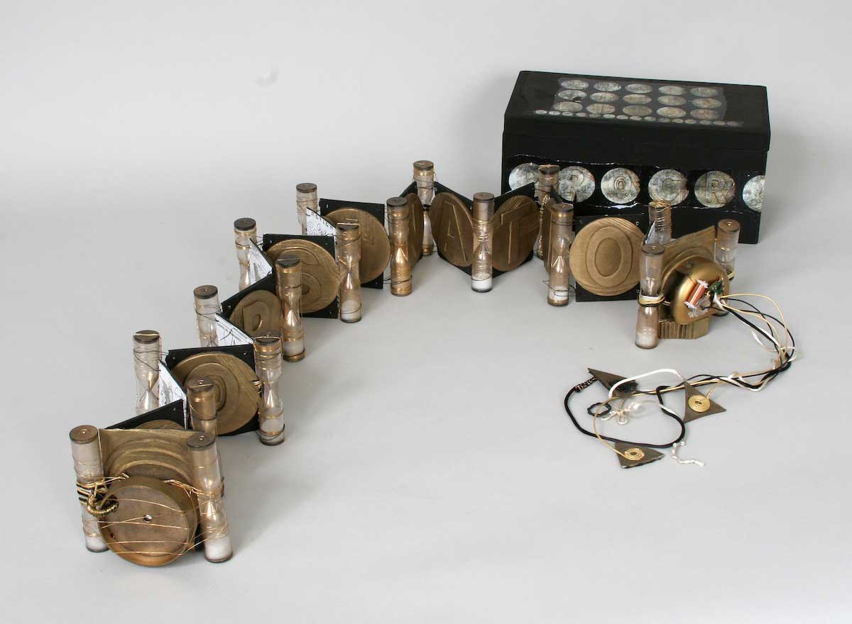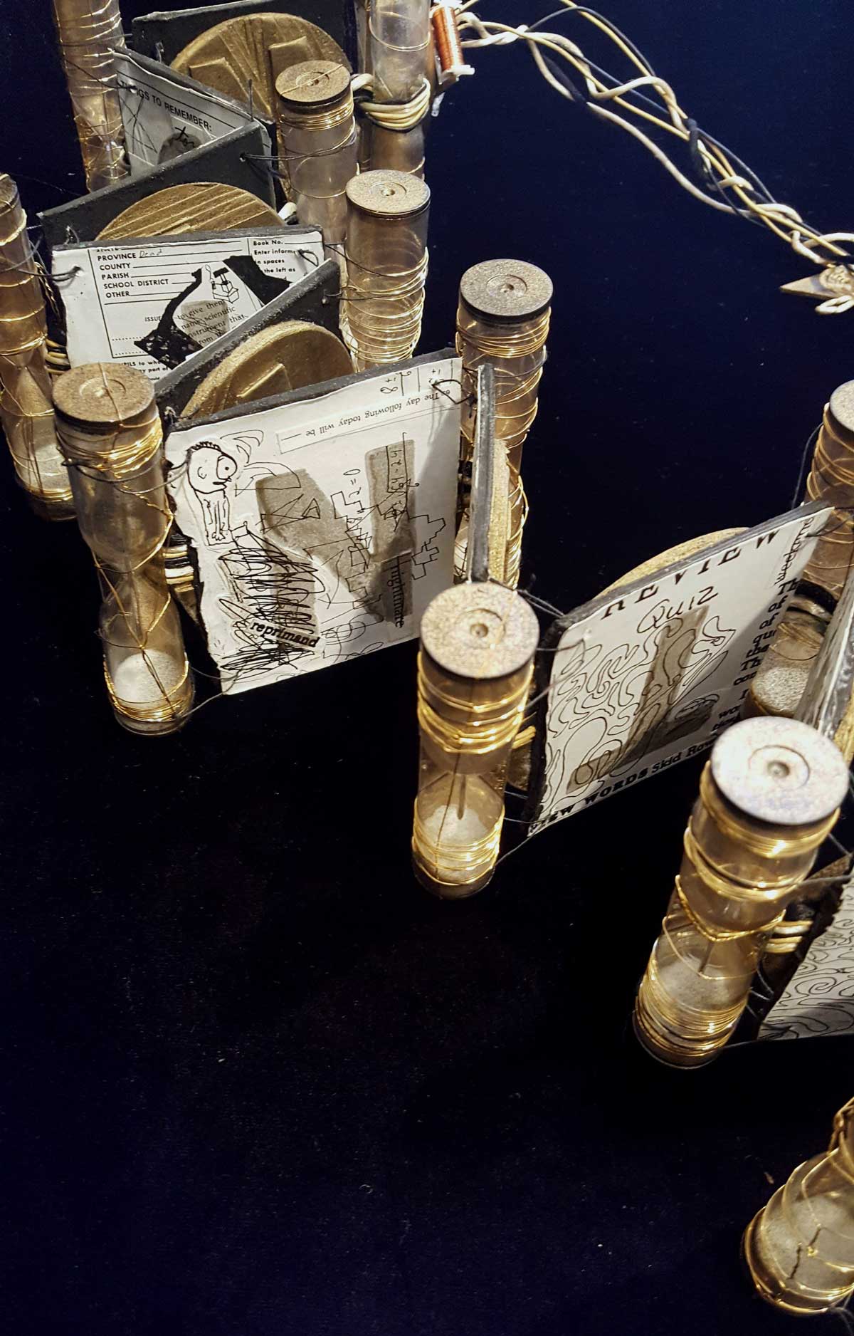 Materials: Found objects, bookboard, photocopies; bound with wire, egg timers, and cord; with box